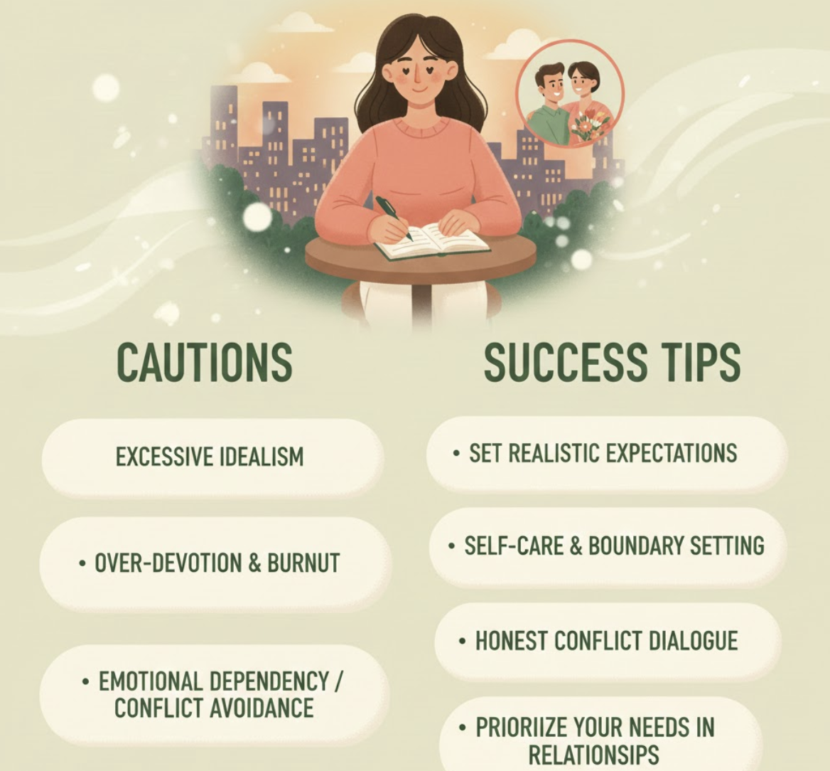 ENFJ는 관계 중심적인 성향 때문에, 파트너에게 감정적으로 의존하기 쉬울 수 있습니다. 자신의 감정을 스스로 조절하고, 독립적인 자아를 유지하는 것이 중요합니다.