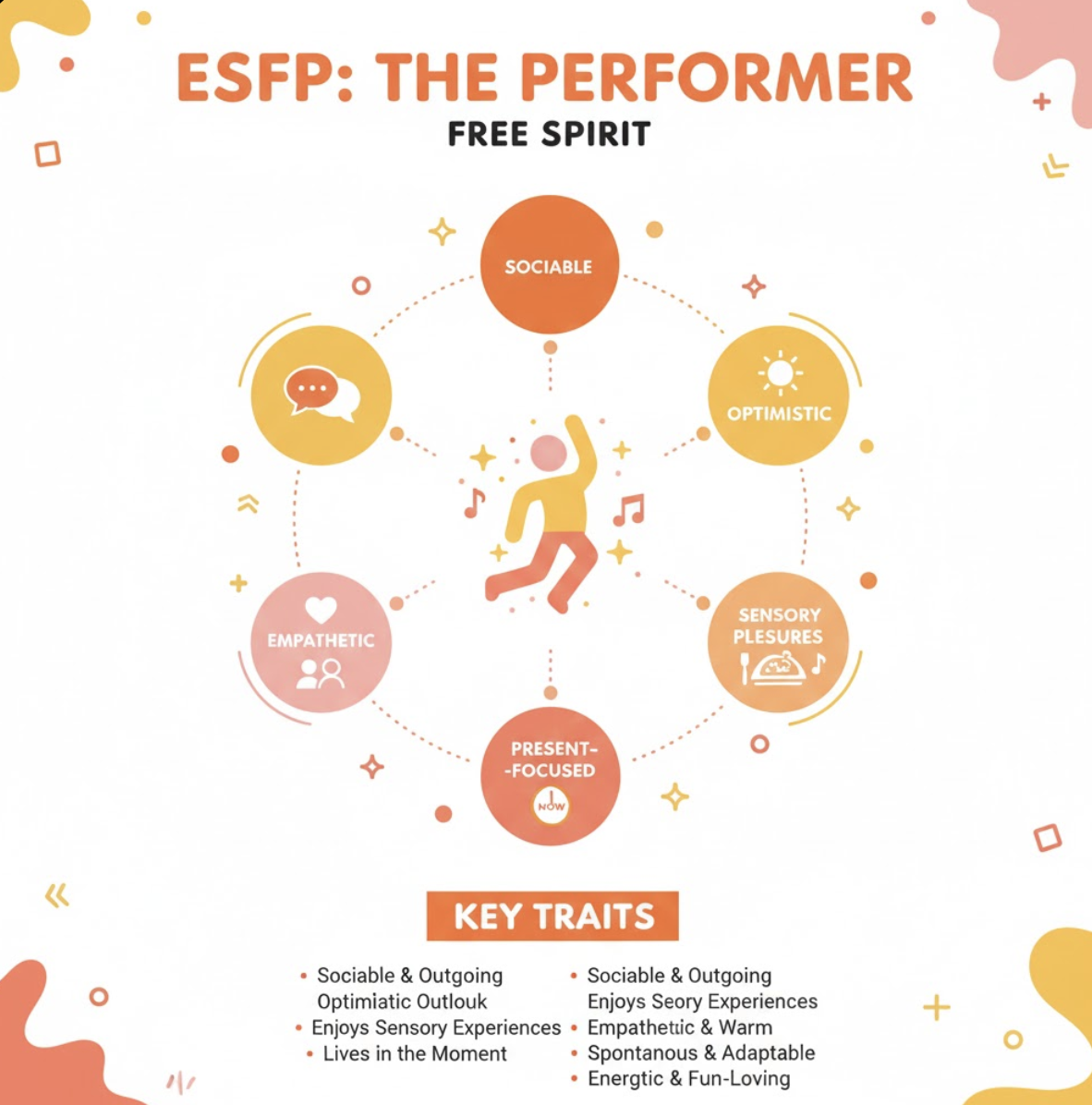 ESFP는 ‘자유로운 영혼’이라고 불릴 만큼 틀에 얽매이지 않고 자유분방한 성격을 지녔습니다. 이들은 뛰어난 관찰력과 공감 능력을 바탕으로 주변 사람들의 감정을 잘 파악하고, 즉흥적이고 재미있는 활동을 통해 즐거움을 추구합니다.