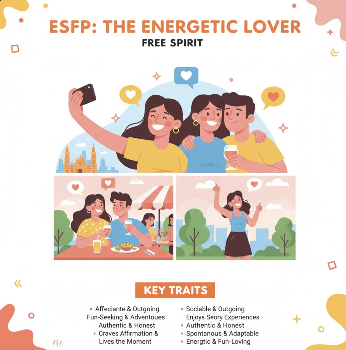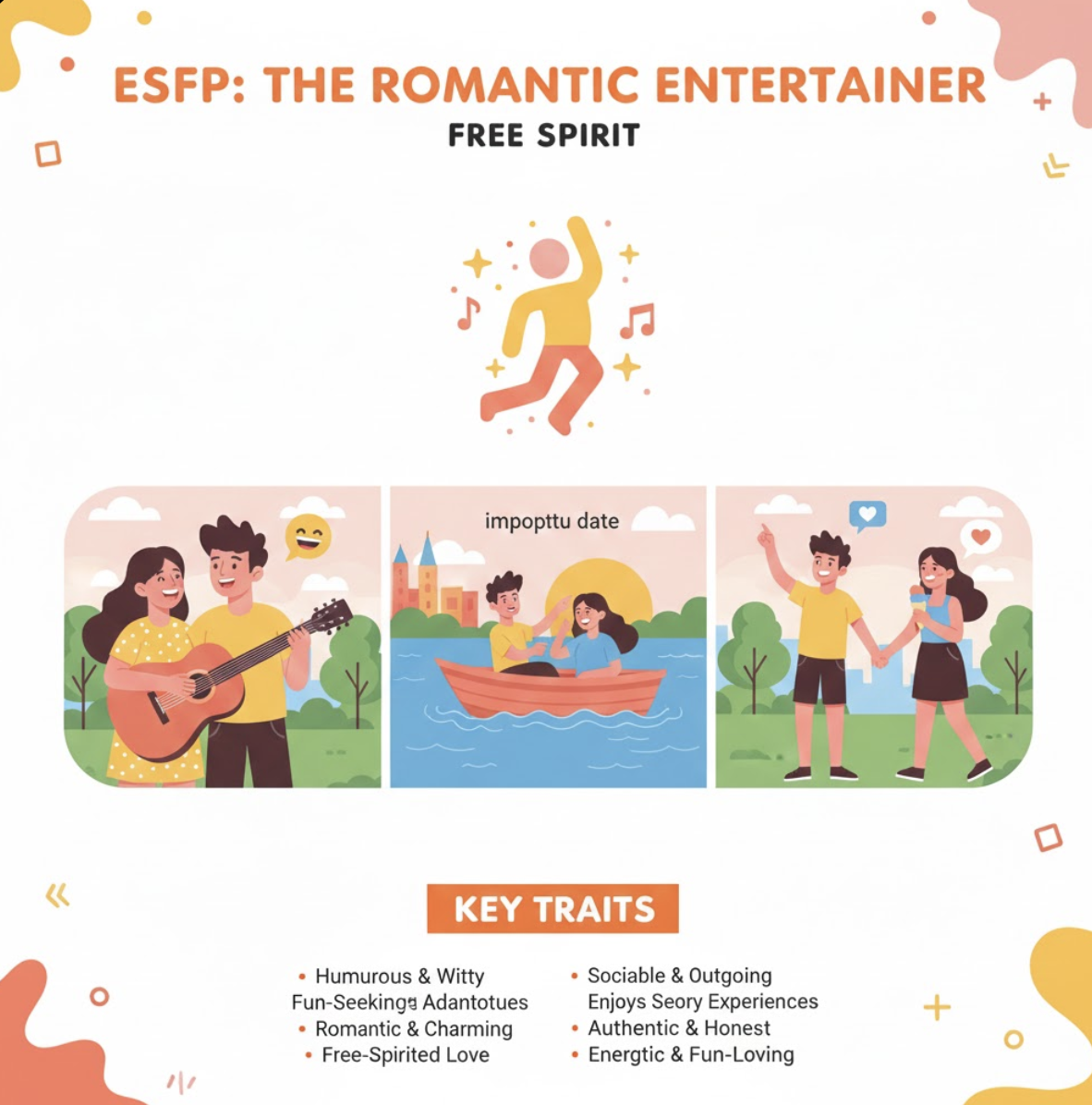 ESFP는 자신과 함께 즐거운 시간을 보낼 수 있는 사람, 긍정적인 에너지를 가진 사람, 그리고 자신의 개성을 존중해주는 사람에게 매력을 느낍니다.