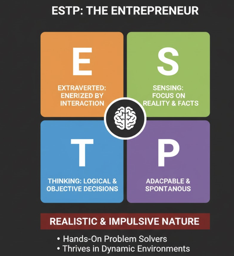 이러한 특징들이 결합되어 ESTP는 뛰어난 현실 적응력, 문제 해결 능력, 그리고 사교성을 갖춘 유형으로 나타납니다. ESTP는 새로운 경험을 추구하고, 도전을 즐기며, 즉흥적인 상황에서도 뛰어난 능력을 발휘합니다.