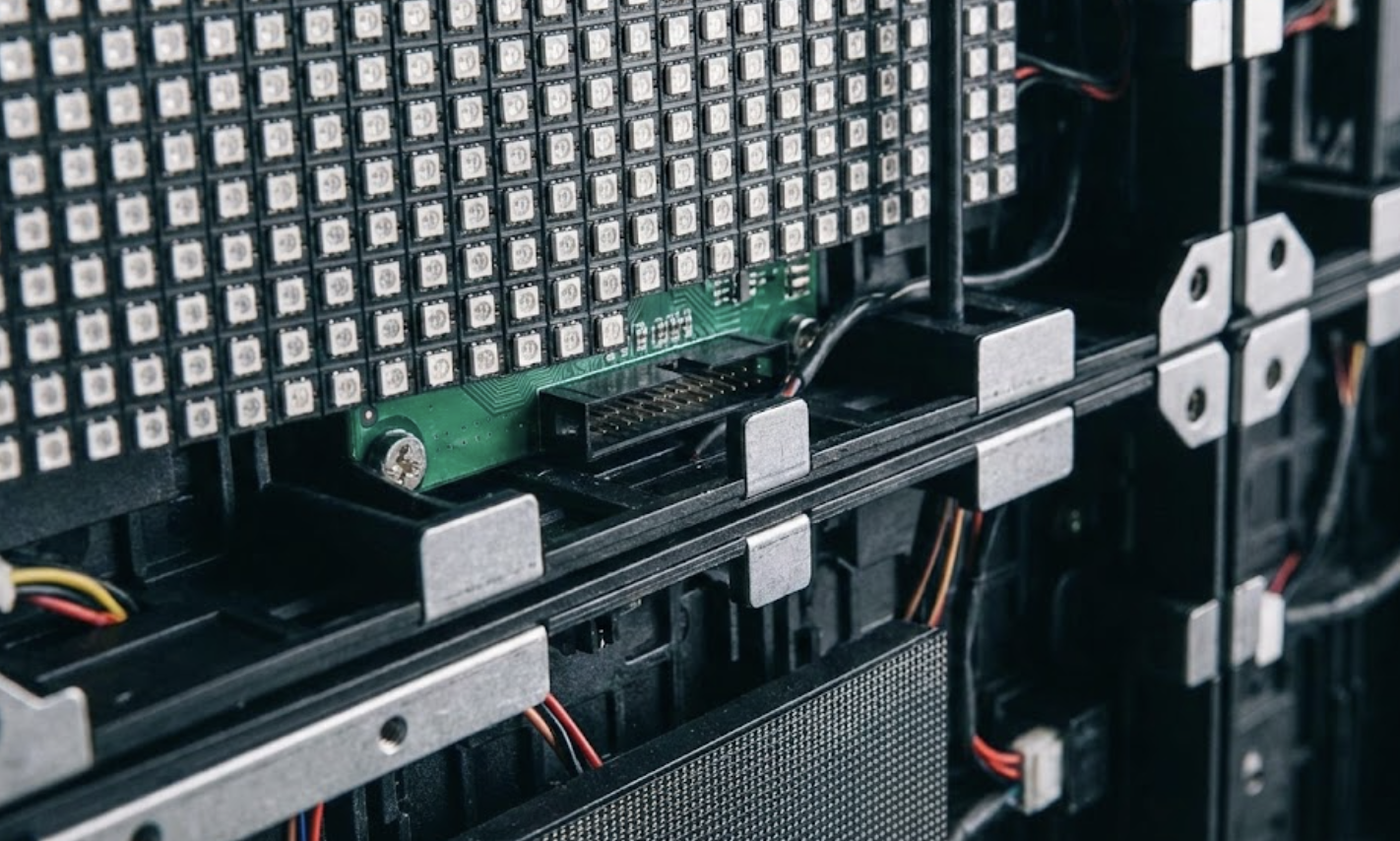 - 제작된 LED 모듈들을 구조물 위에 하나씩 조립하여 전광판 형태를 완성합니다.