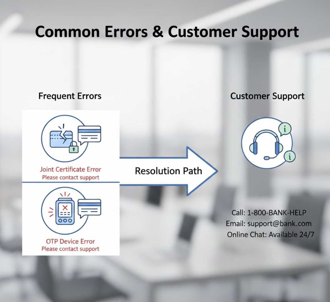 - 보안카드 번호 오류: 보안카드 앞뒷면의 지시에 따라 정확한 번호를 입력했는지 확인합니다. 보안카드를 분실했거나 훼손된 경우 영업점에서 재발급받아야 합니다.